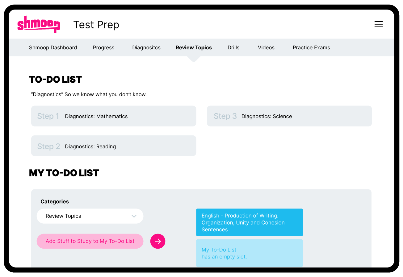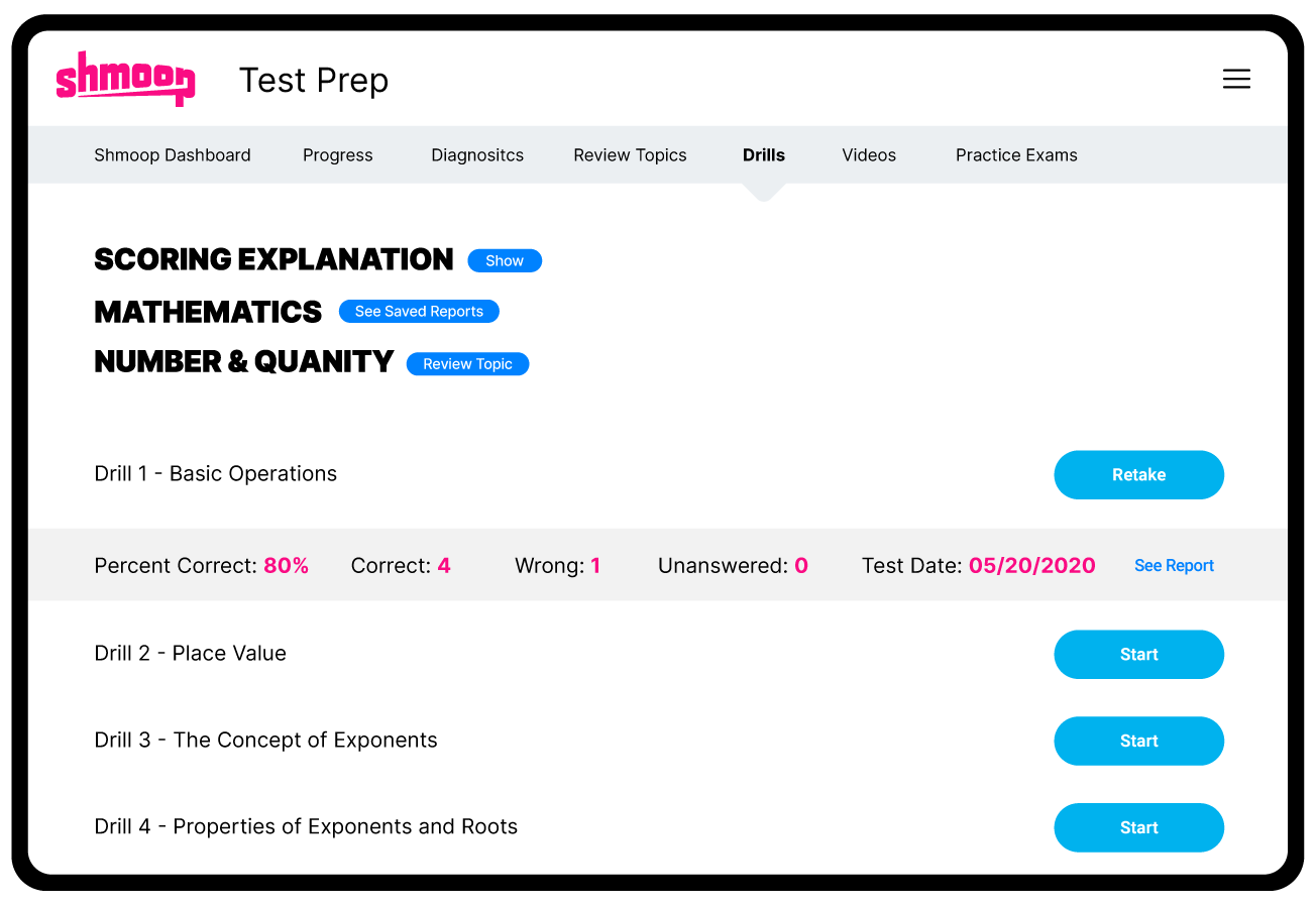 Students can access drills, videos, review topics and full length practice exams to improve and master deficient areas.